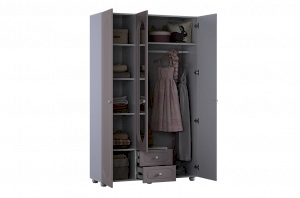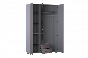 Шкаф оснащён тремя распашными дверями: две крайние двери выполнены из МДФ, а средняя дверь дополнена зеркалом, которое визуально расширяет пространство и делает комнату светлее. В нижней части предусмотрены два выкатных ящика, подходящих для хранения белья, аксессуаров или повседневных вещей.